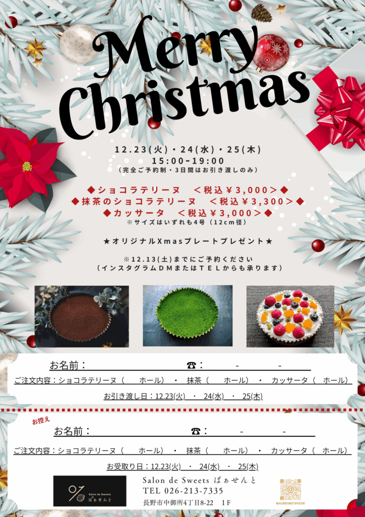 なお、Xmasスイーツは完全ご予約制(店頭の他・InstagramDM・TELからお申し付けください)となりますので、ご了承くださいますようお願い申し上げます。